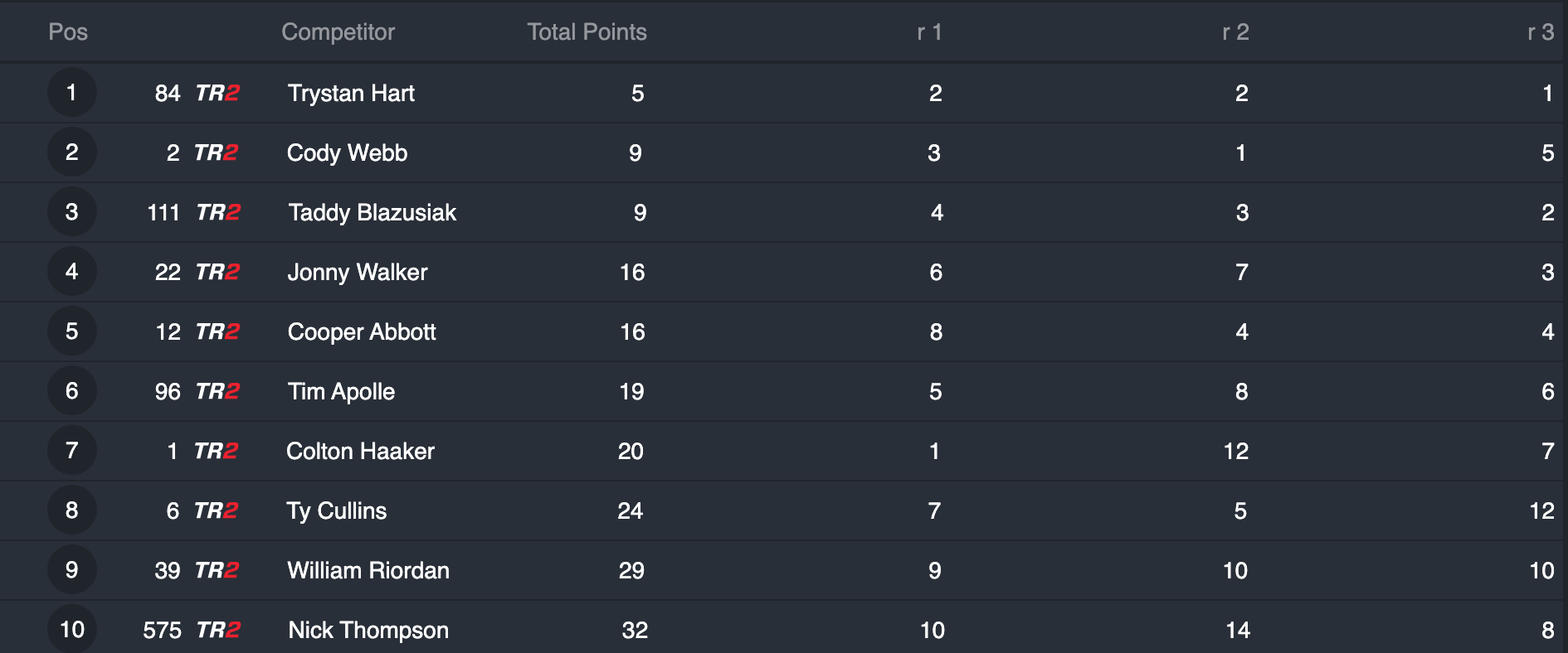 Note: Taddy Blazusuak received a two-position penalty following the third round.