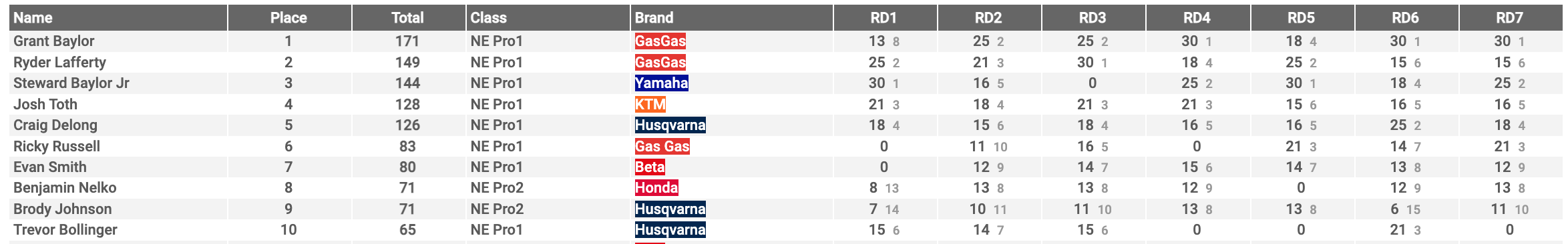 | 6 | Grant Baylor | 03:19:04.317 | Belton, SC | GasGas | ||