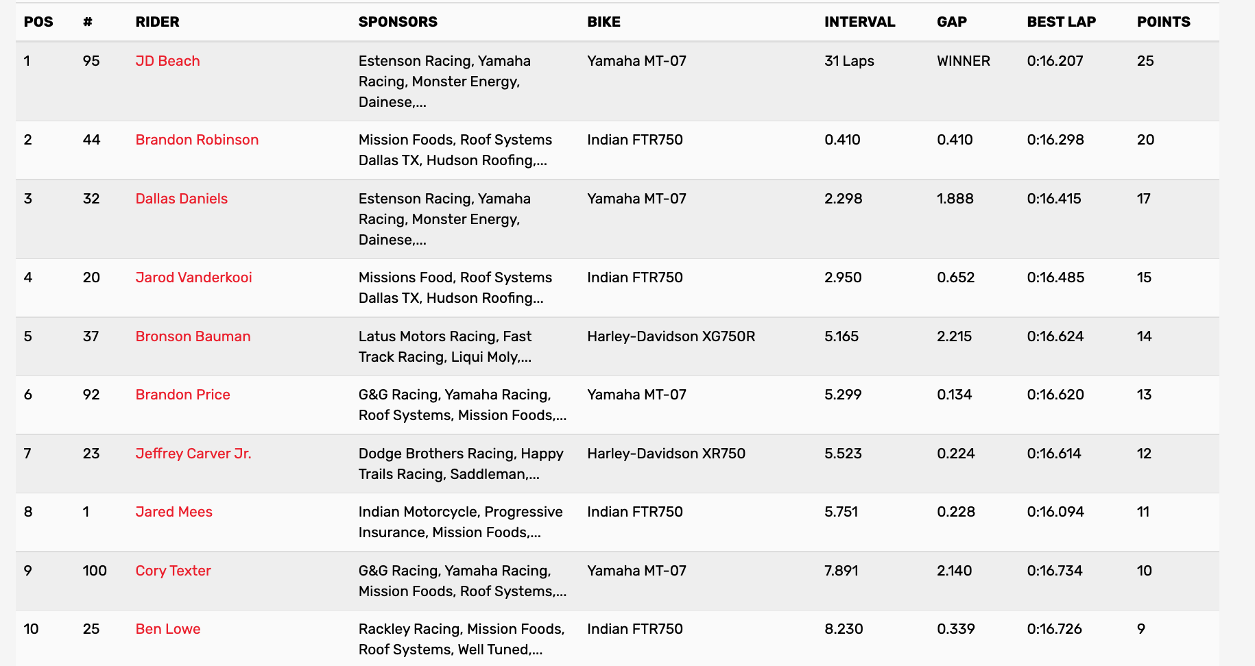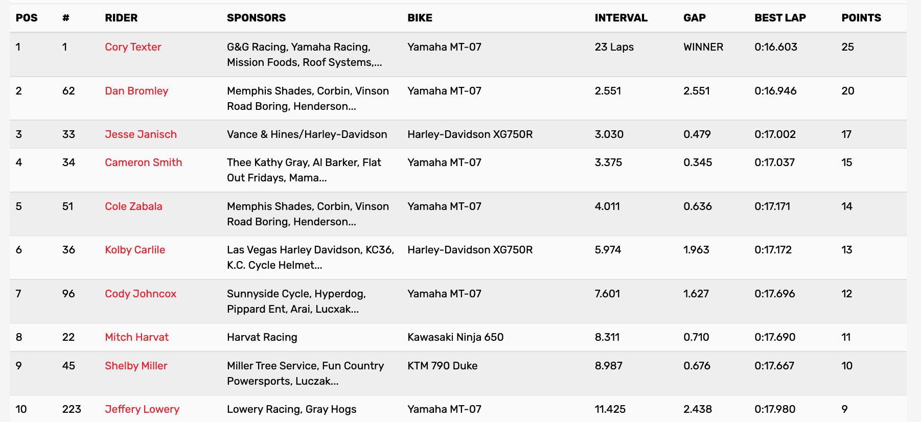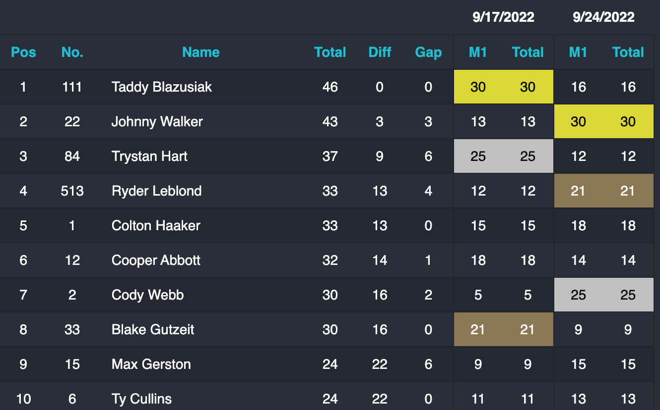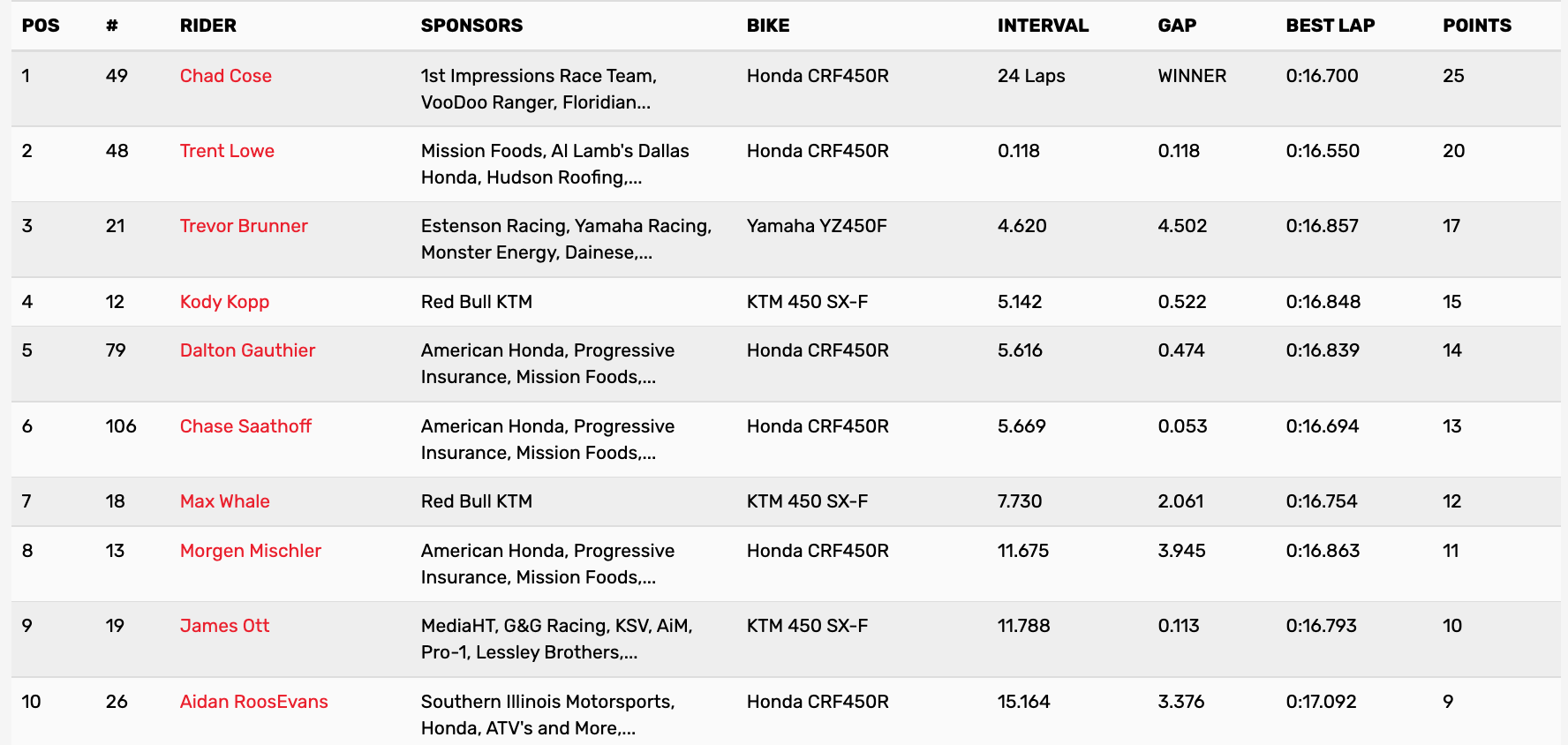 September 24, 2022| Rider | Time | Interval | Best Lap | Hometown | Bike | |
