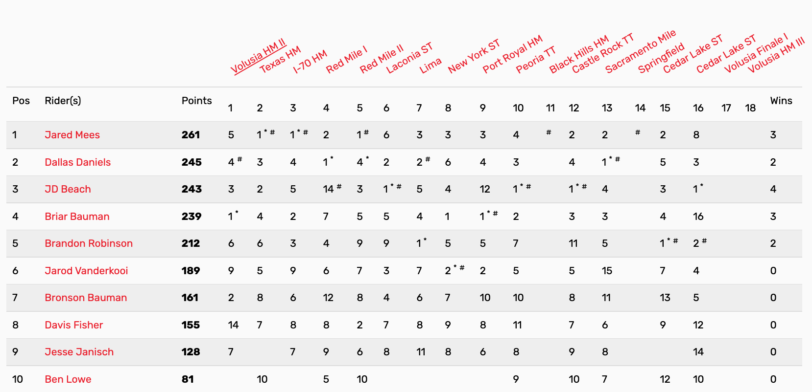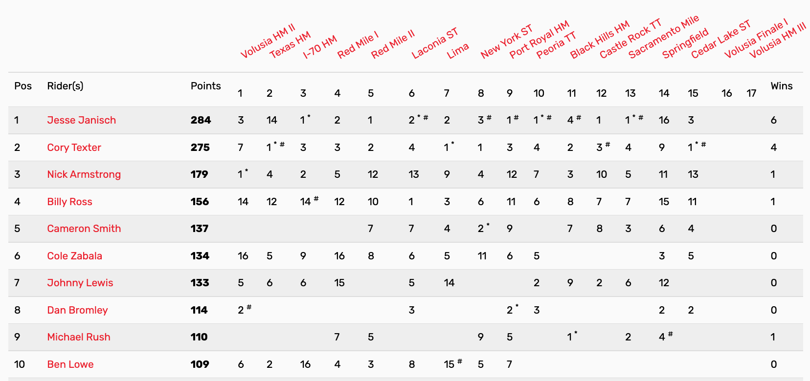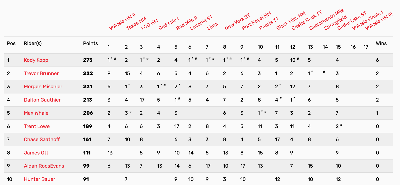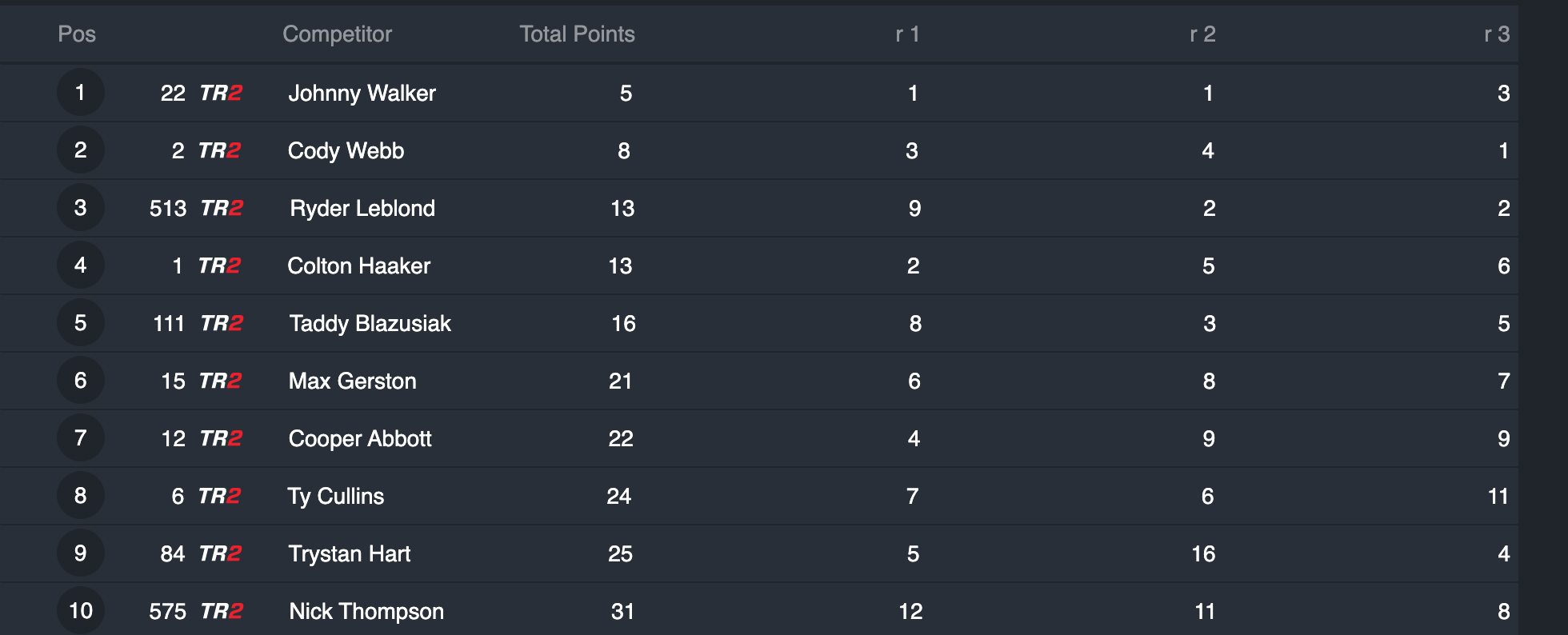 | Position | Rider | Hometown | Points |
