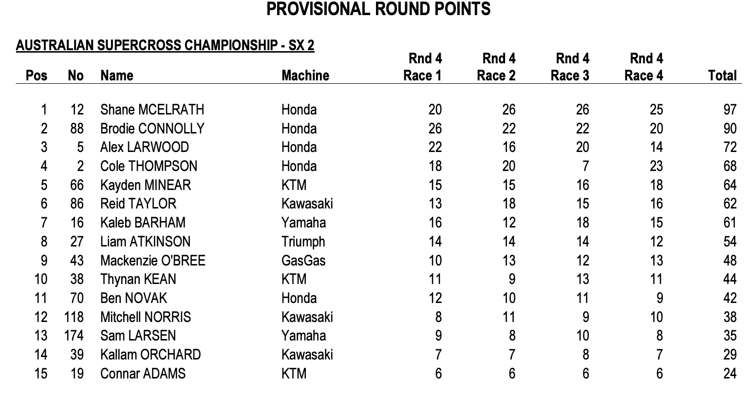 | Shane McElrath (Honda) | AUS-X Open | SX2 |