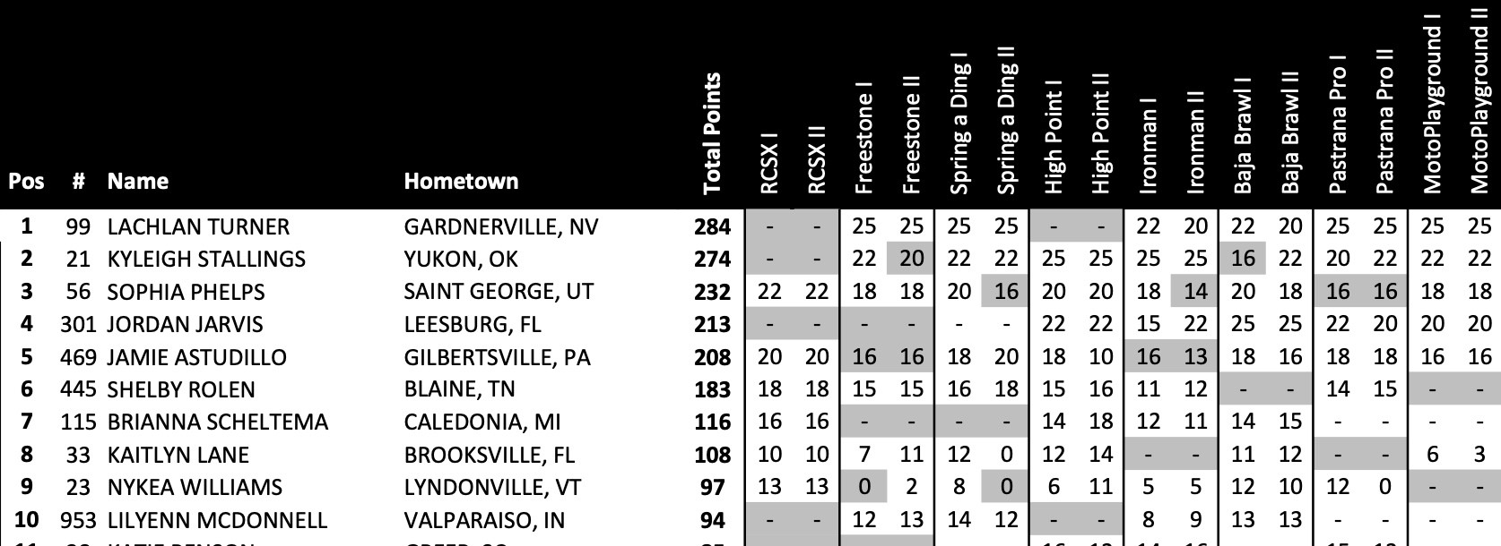 With three rounds left in the season, at the Baja Brawl veteran Jordan Jarvis got her only overall of the year by winning both motos. Turner finished second and Stallings third, respectively, keeping the title chase closer than ever between the two young riders. But then Turner went on another winning streak starting at the Pastrana Pro Challenge, winning both motos as well as both motos at Ponca City, claiming the championship. Stallings would finish ten points behind in second and a consistent Sophia Phelps finished the season in third.