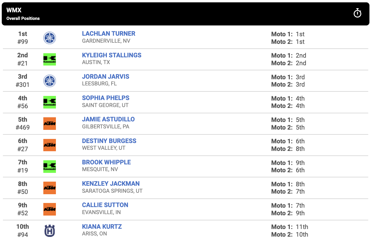 Turner showed up for the first time in 2024 at the Spring Nationals in Texas sweeping all four motos at Freestone and Spring a Ding Ding. Mikayla Nielson and Kyleigh Stallings swapped moto scores at Freestone finishing second and third respectively. Stallings rebounded to finish second at Spring a Ding Ding and Jamie Astudillo rounded out the podium in third.