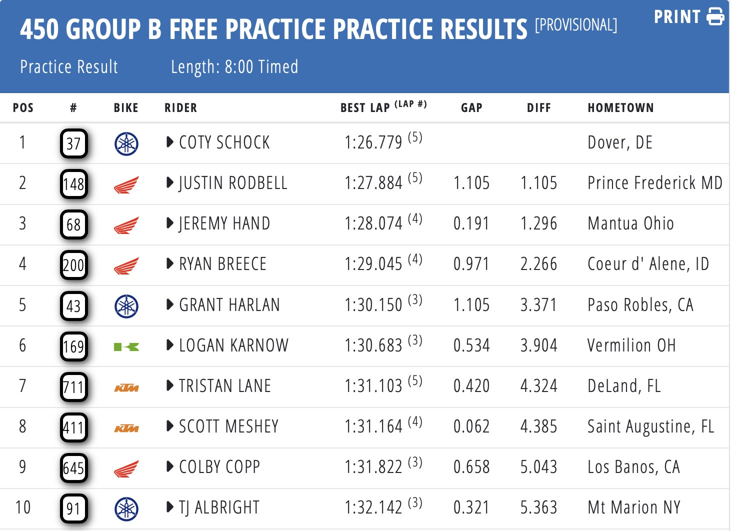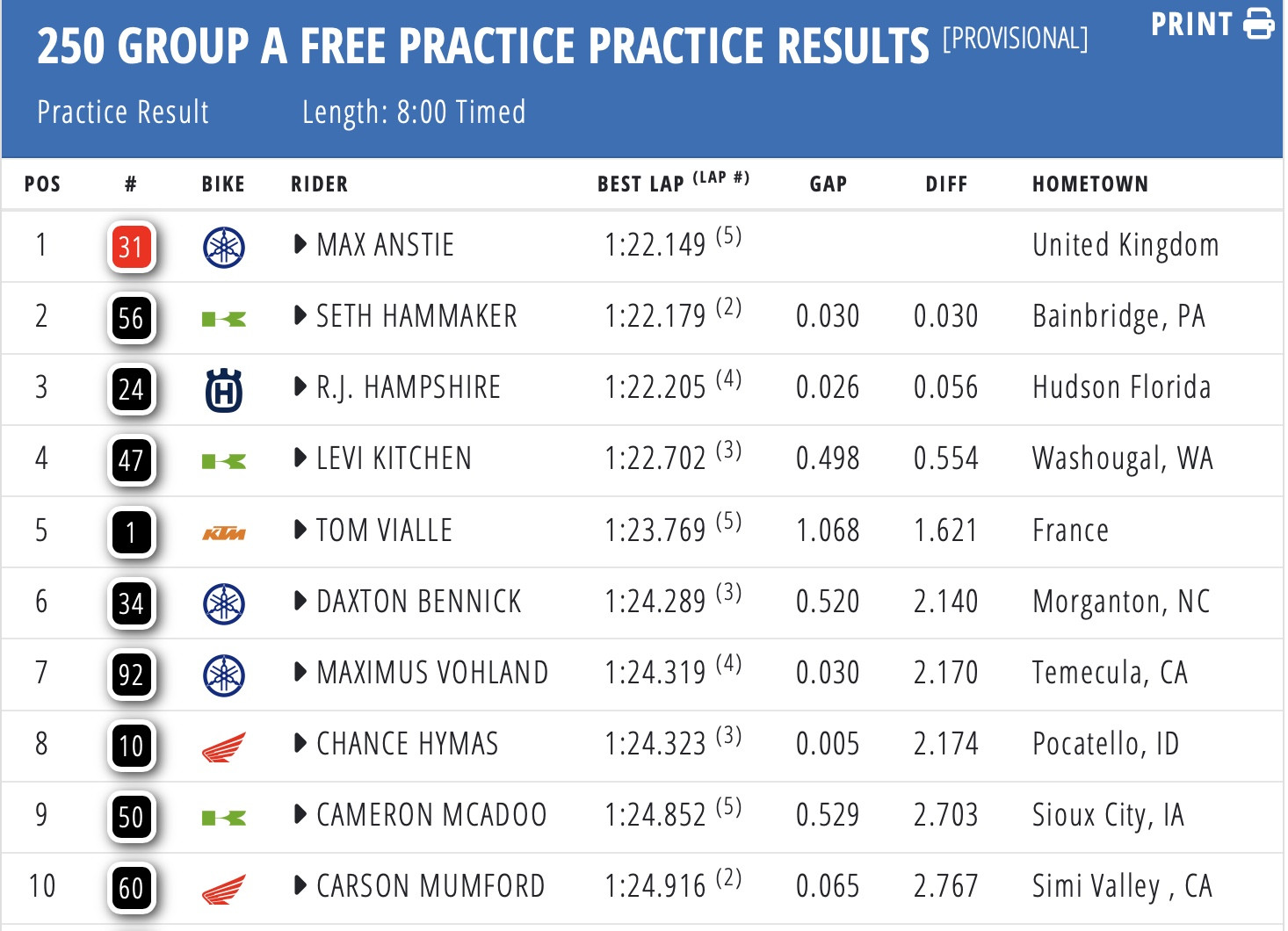 | 5 | Chase Sexton | 1:19.406 | La Moille, IL | KTM |